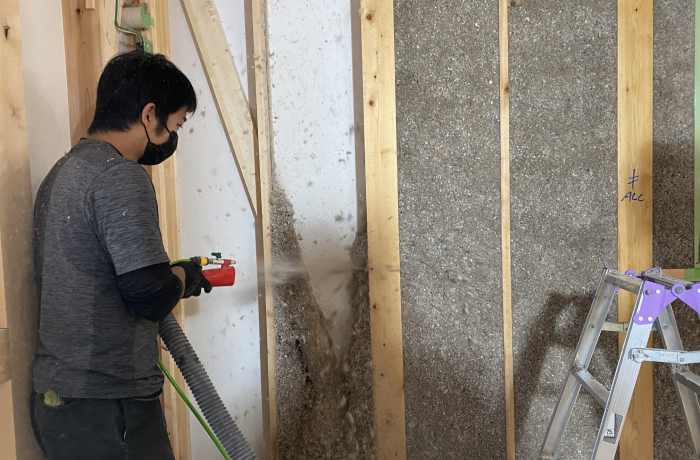 私たちが使う断熱材は断熱効果だけではなく、吸音性や調湿性を持つ「セルロースファイバー」です。